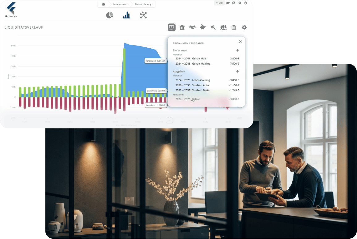 Alle Finanzströme und Investments werden übersichtlich dargestellt und in verschiedene Zukunftsszenarien übertragen. So erkennen Sie schwarz auf weiß, wie sich Ihre heutigen Entscheidungen auf morgen auswirken.